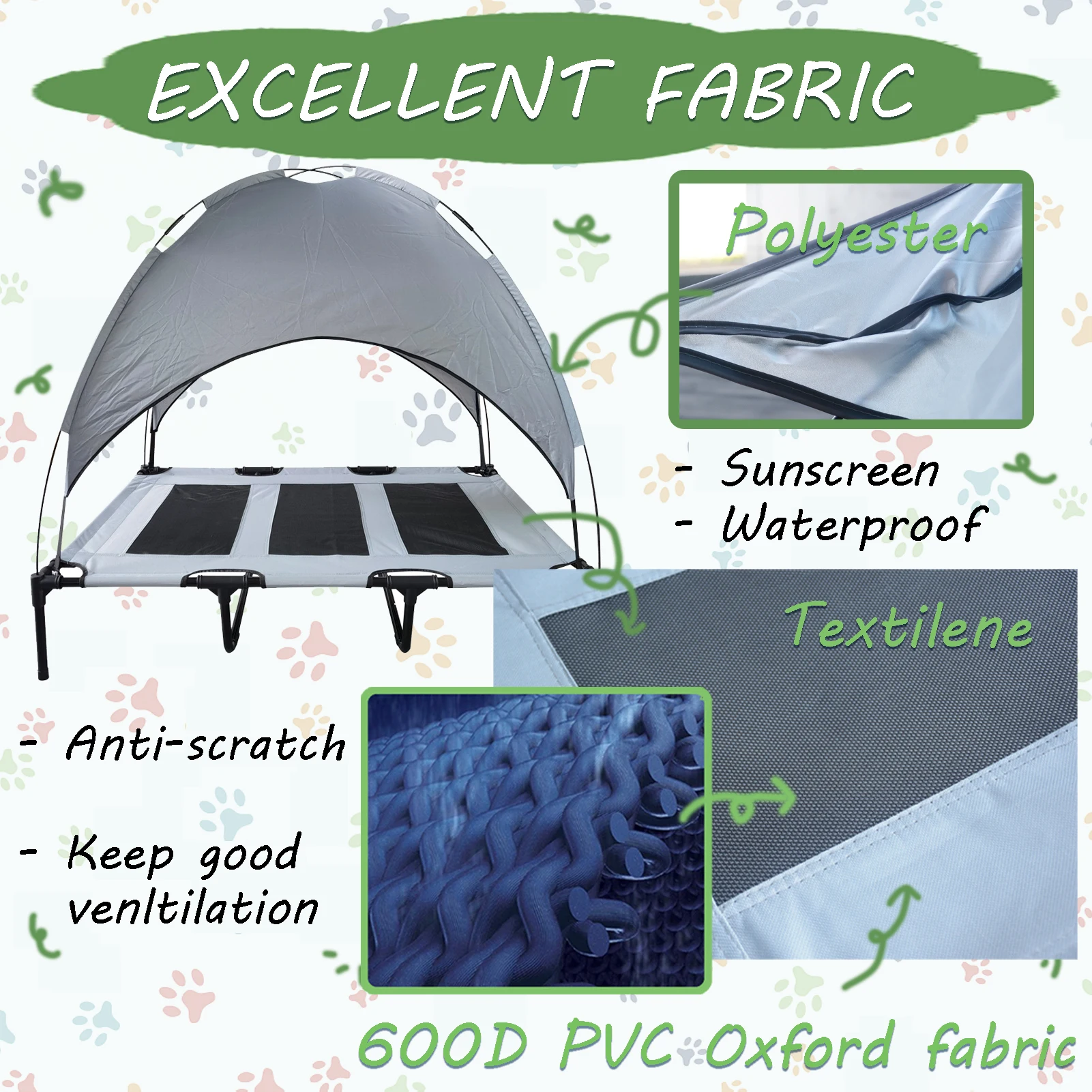【Comfortable and Cool Fabric】- the solid Anti-scratch 600D Oxford fabric reduces the chance of dogs scratching the fabric and prolongs the life of the bed. The center of the bed used Textile fabric to maintain good ventilation. When your four-legged Pal is lying in bed in summer, it will feel cool, reducing the risk of skin diseases due to the heat. The canopy is made of polyester fabric to protect your pet from the sunlight. The fabric is slightly waterproof, so if it rains you need to move the bed indoors.