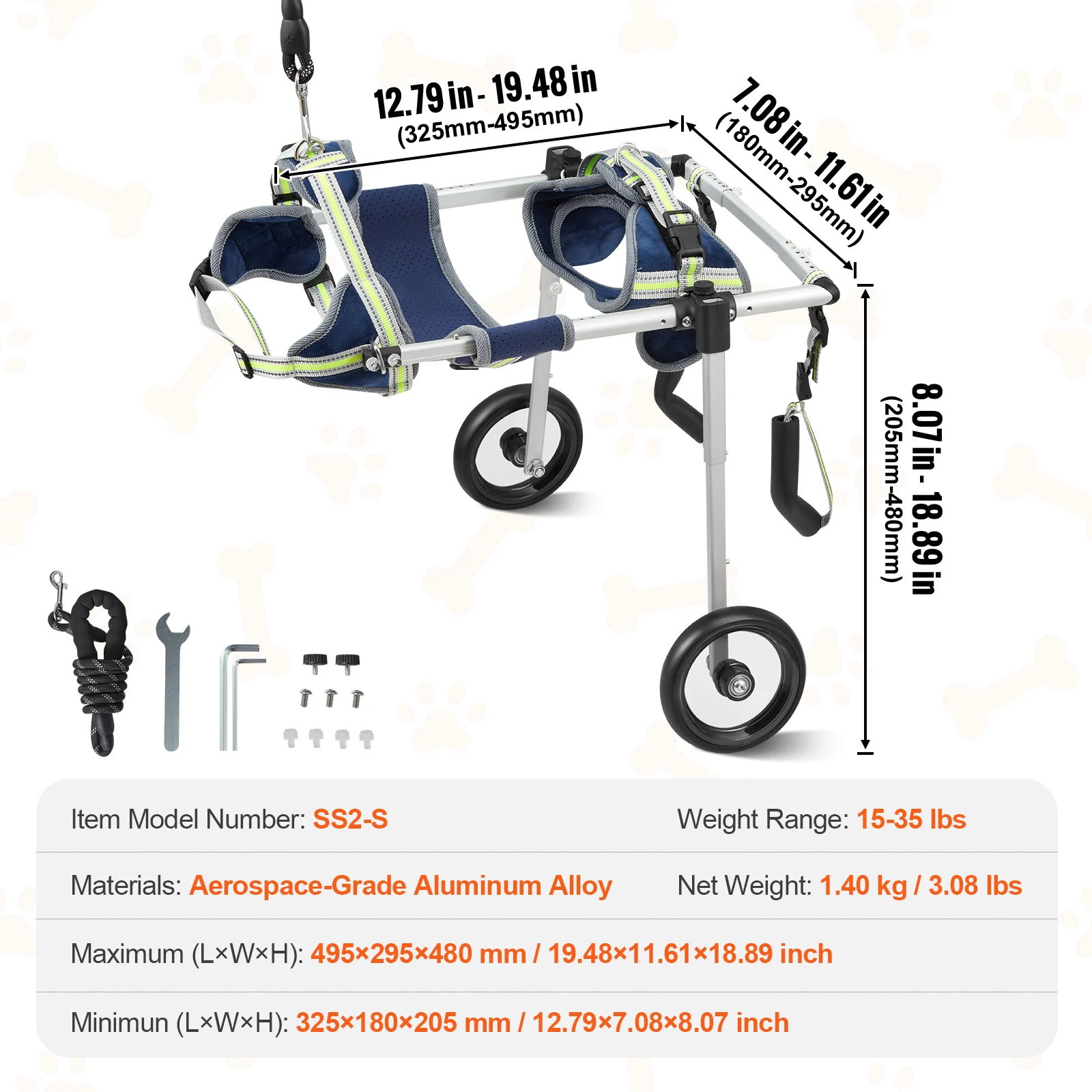 Adjustable Size: The pet wheelchair/cart can be adjusted to fit pets of different sizes, including small dogs up to 15lbs. The product's structural design is aimed at assisting pets with disabled hind legs but normal front legs, helping them regain the joy of running outdoors.